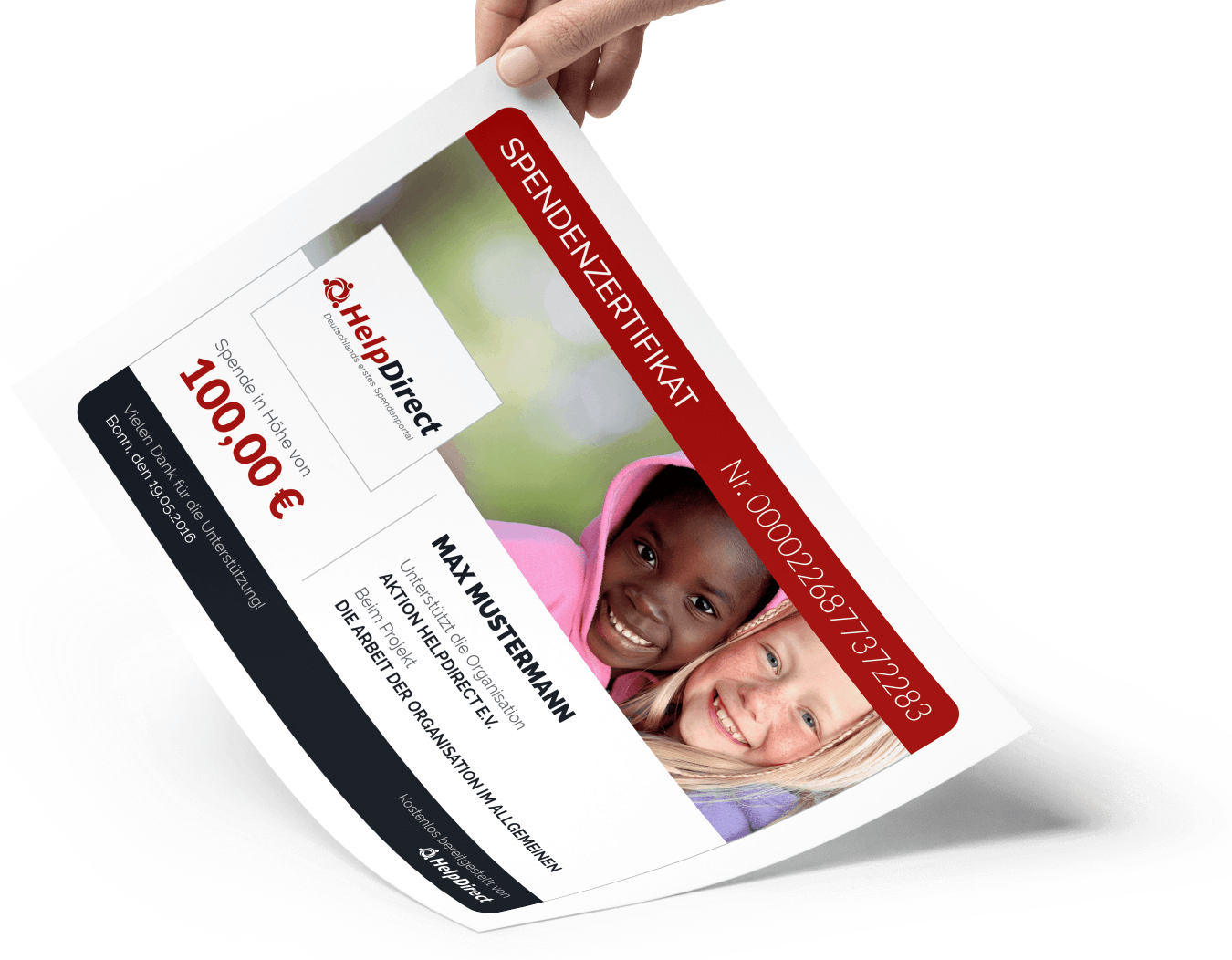 Für deine Unterstützung mit deiner Spende erhältst du als Dankschön ein individuelles Spendenzertifikat mit deinem Namen per E-Mail. Damit hast du eine bleibende Erinnerung an deine gute Tat!